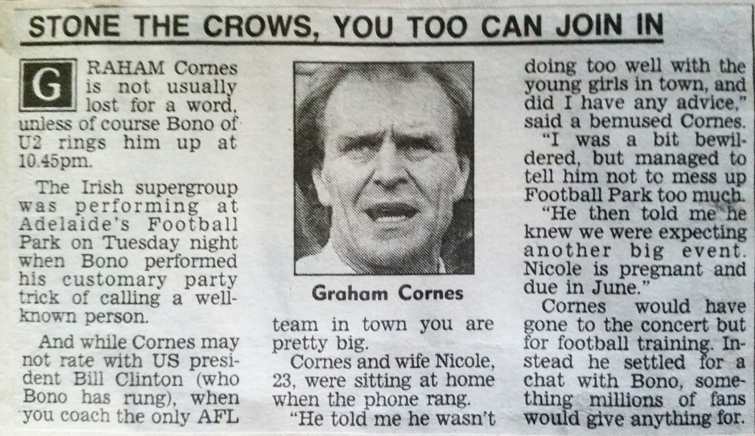 When U2’s Zoo TV extravaganza lit up the Football Park turf in Adelaide on November 16, 1993, South Australian football legend Graham Cornes was the recipient of Bono’s phone call.