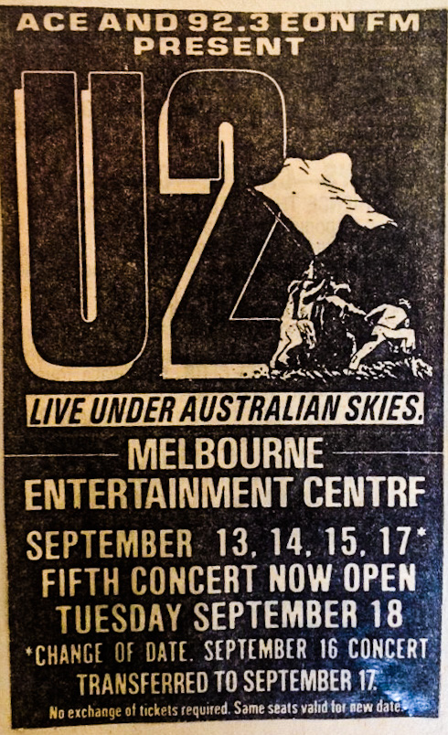 I went to the first Australian shows in Melbourne (Live Under Australian Skies Tour, September 1984), at the Melbourne Sports and Entertainment Centre (today known as the Westpac Centre). I got myself to the 2nd row. Someone handed out cut up pieces of paper with the instruction of ‘’when Bono touches the mic, throw the paper in the air”.